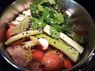 Vegetable Stock Vegetarian Version- vegetable scraps (4-6 cups) of celery, carrots, onions, garlic with skins, parsnips,celeriac root etc. Any vegetable or scraps is acceptable except those that fall into the cruciferous family, like broccoli or cauliflower - it imparts a bitter taste to the stock.
