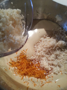 Using a spatula stir in the orange or lemon zest, the juice (either lemon or orange depending which zest you have chosen), vanilla and almond extract (if using), the flour (if you sift the almond flour into the egg yolk mixture, it will help give a fluffier texture to the final product) and salt, reserving a pinch of salt for the egg whites. Mix well.