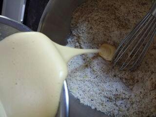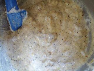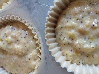 using a spatula, add the egg yolk mix and lemon juice to the dry mix and combine well. A muffin dough will form.
