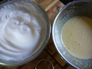 beat the egg whites, adding the pinch of salt. Beat till you get fluffy peaks. Set aside.