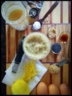 In a medium bowl, combine the almond flour, baking soda, baking powder, chia or flax, poppy seed, lemon zest and ginger. Mix together