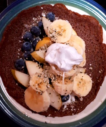 Breakfast Fruit Wrap: blueberries, bananas, pear, nut or seed butter spread, top with hemps seeds and coconut whip or drizzle with little honey or maple syrup!! Delicious!!
